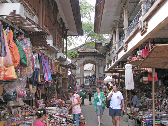 朝市が終了すると、広場でお店を広げていた農家のおばさんたちは、店をたたんで家に帰り、変わってそれまで閉じられていた常設のお店が開店します。これら常設のお店の大半は観光客向けのお土産店で、ウブド市場はたくさんのお土産屋さんがひしめくお土産市場になります。